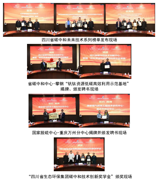 开幕式上,发布了四川省碳中和未来技术系列榜单,为省碳中和中心-攀钢“钒钛资源低碳高效利用示范基地”揭牌、颁发聘书,国家脱硫中心-重庆万州分中心签约、揭牌并颁发聘书,为“四川省生态环保集团碳中和技术创新奖学金”获奖学生代表颁奖。