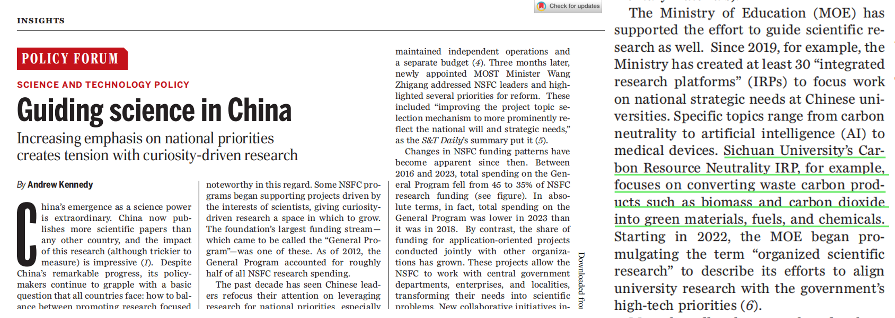 2025年3月28日出版的第387期《科学》杂志发表了澳大利亚国立大学克劳福德经济与政府学院安德鲁·肯尼迪(Andrew Kennedy)教授的政策论文“中国的科研模式正在影响全球”,解释中国的政策制定者如何在国家战略需求研究和自由探索基础研究之间取得平衡。