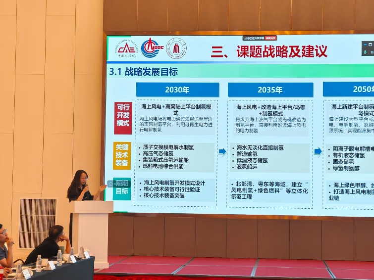 我院吴霁薇副研究员负责“我国海上浮式风电产业发展战略研究”项目任务五个课题之一“海上浮式风电规模化开发电氢耦合技术及装备研究”。会上,吴霁薇从项目基本情况、主要研究成果和课题战略及建议三个方面介绍了该课题项目研究进展与结题成果。