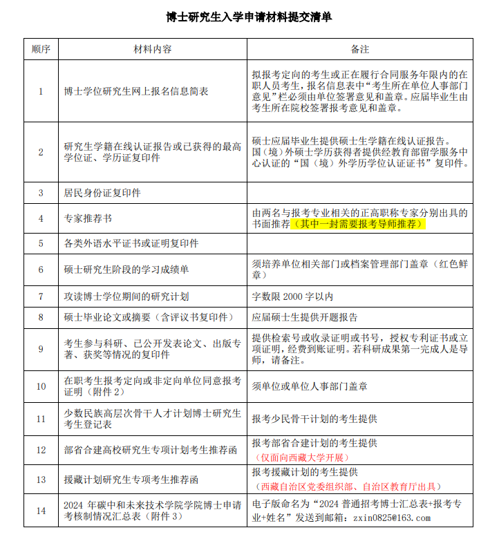 符合报考条件的人员须下载 “提交博士研究生入学申请材料自查表”(附件1),按顺序整理材料,并在2023年12月15日17点前将申请材料和自查表寄送达我院研究生招生工作办公室(联系地址:122cc太阳集成游戏望江校区行政楼碳中和未来技术学院605办公室;联系人:郑老师;联系电话:028-85464677;邮编:610000)。