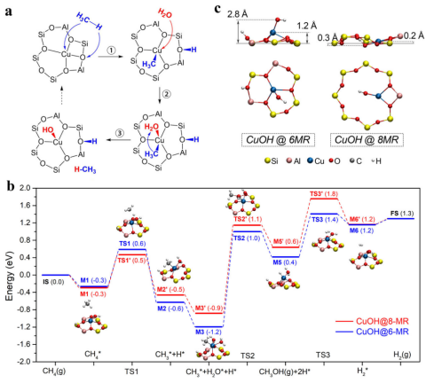 研究者通过DFT理论计算提出了6MR限域的Cu单位点催化甲烷-蒸气反应的可能机理,并揭示了反应过程中活性位结构与能量变化。通过与8MR限域的Cu单位点相比较,说明了6MR限域环境表现了较低的反应过渡态能量,因此有利于产物的脱附。